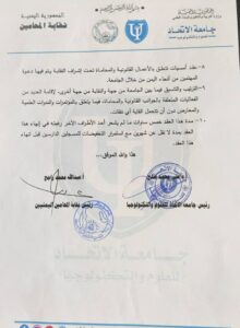 وقّع الاتفاق عن النقابة الأستاذ المحامي عبدالله راجح – نقيب المحامين اليمنيين، وعن الجامعة الدكتور علي محمد صلح – رئيس جامعة الاتحاد للعلوم والتكنولوجيا.
