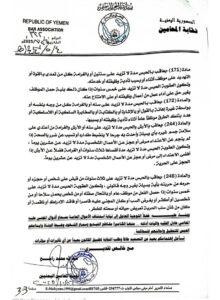 تهديكم نقابة المحامين اليمنيين بالغ تقديرها، ونود إبلاغكم بأن النقابة تلقت بلاغاً مفاده انه في ظهر يوم الثلاثاء 29 من ربيع الثاني 1447هـ الموافق 21/10/2025م قامت مجموعة من أفراد الأمن المركزي المتواجدين في محكمة جنوب غرب الأمانة بالاعتداء على المحامي الأستاذ / عادل محمد صغير الفقيه بالسب والضرب بأعقاب البنادق والركل ومحاولة مصادرة هاتفه ومقتنياته الشخصية واقتياده عنوة من قاعة المحكمة إلى دينة السجن المركزي أمام القاضي الجزائي/ إبراهيم زيدان وعضو النيابة ومن كان حاضراً قي قاعة الجلسات وفي المحكمة من المواطنين ، وتهديده بالسجن والدعس ما أدى إلى اصابته بالعديد من الإصابات المتوسطة والجسيمة كل ذلك بسبب وأثناء تأديته لعمله، ودون أي مسوغ قانوني